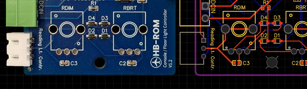 To prevent both sides from losing lighting in the event of a DC power bus failure, the captain’s side is connected to the DC1 bus, while the first officer’s side is connected to the DC2 bus. The goal was therefore to design a circuit board for each cockpit side that replicates exactly this logic in the simulator and also allows the brightness for the BRT and DIM settings to be adjusted individually using a potentiometer on the circuit board.